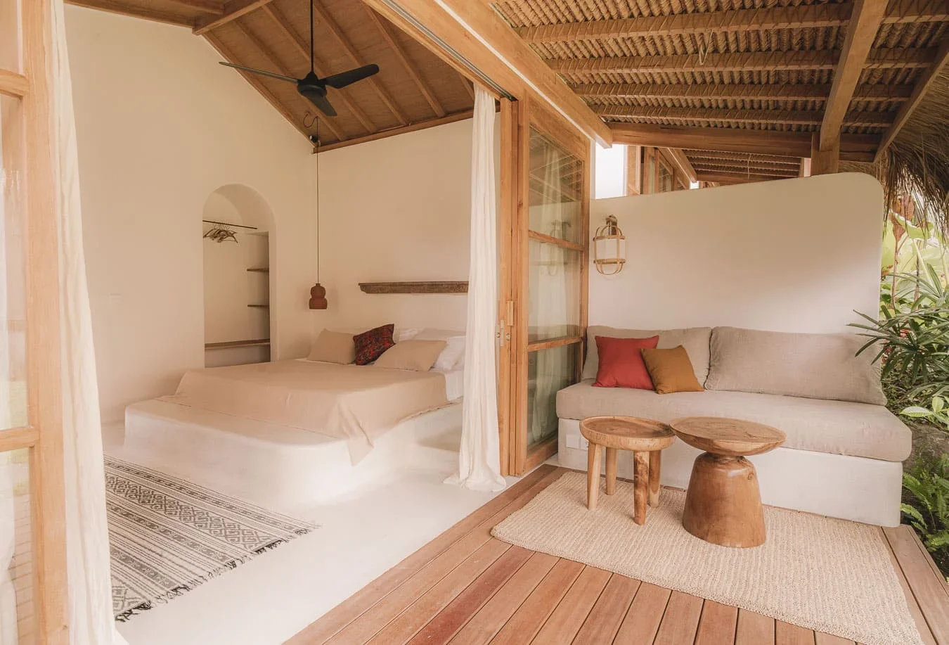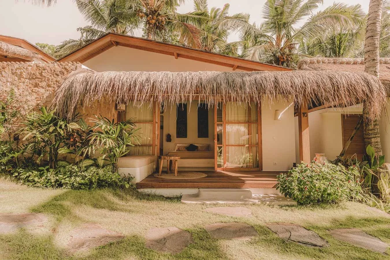Every room opens via sliding glass doors to a lush tropical garden and features coconut and teak wood accents.